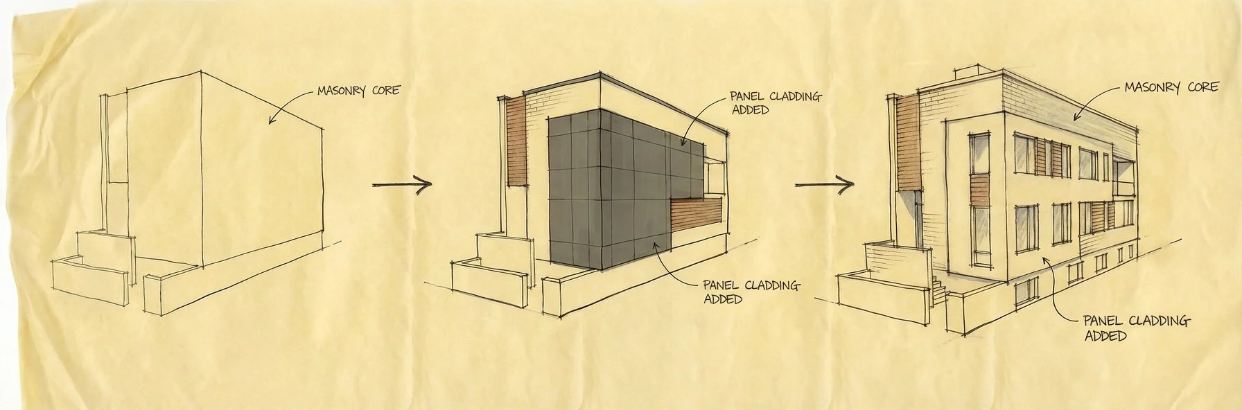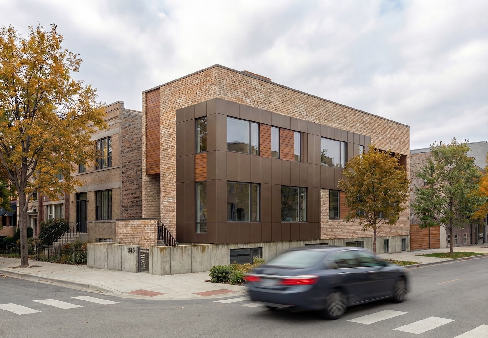 A urban residence on a narrow corner lot that maximizes natural light without compromising privacy. We utilized strategic corner-glazing to pull light deep into the floor plate, paired with a bronze cladding and an elevated terrace. This architectural shift allows the home to engage with the surrounding tree canopy while remaining a secure, secluded retreat at street level.