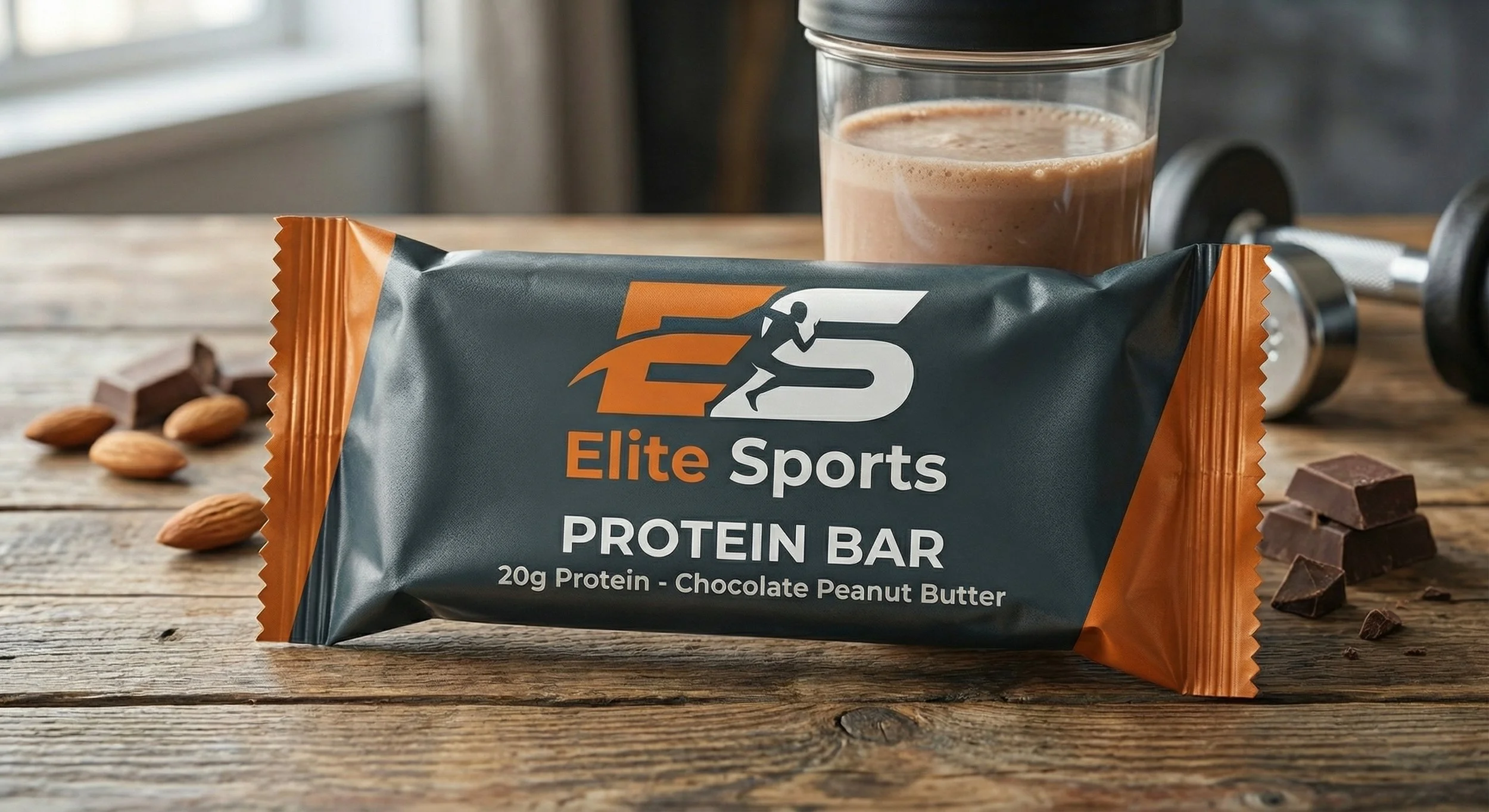 The Solution: A "360-degree Ecosystem." Elite Sports doesn't just sell a shirt; it provides the fuel (bars), the hydration (water), and the gear (apparel) needed to "Own Your Limits." The image must feel raw, expensive, and tactile.The visual identity charcoal greys, vibrant safety oranges, and sharp, italicized typography communicates speed and reliability.